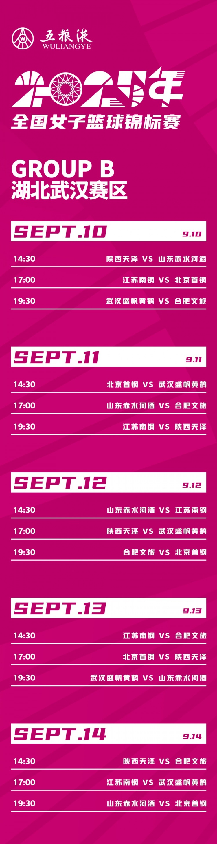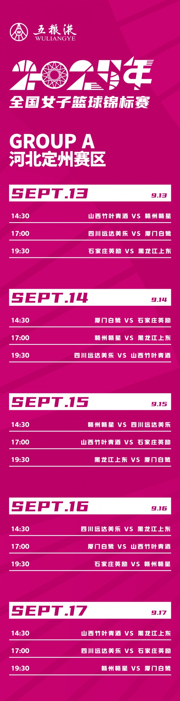 五粮液2025年全国女子篮球锦标赛由中国篮球协会主办、深篮体育(北京)有限公司作为办赛机构,将于9月10日至9月21日分别在湖北省武汉市、河北省定州市、浙江省诸暨市举办。