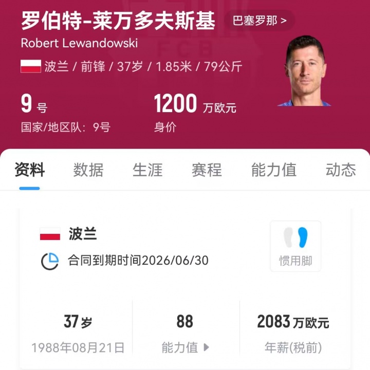 09月30日讯 目前37岁的莱万多夫斯基目前与巴萨的合同已经进入最后一年,将于2026年6月30日到期。